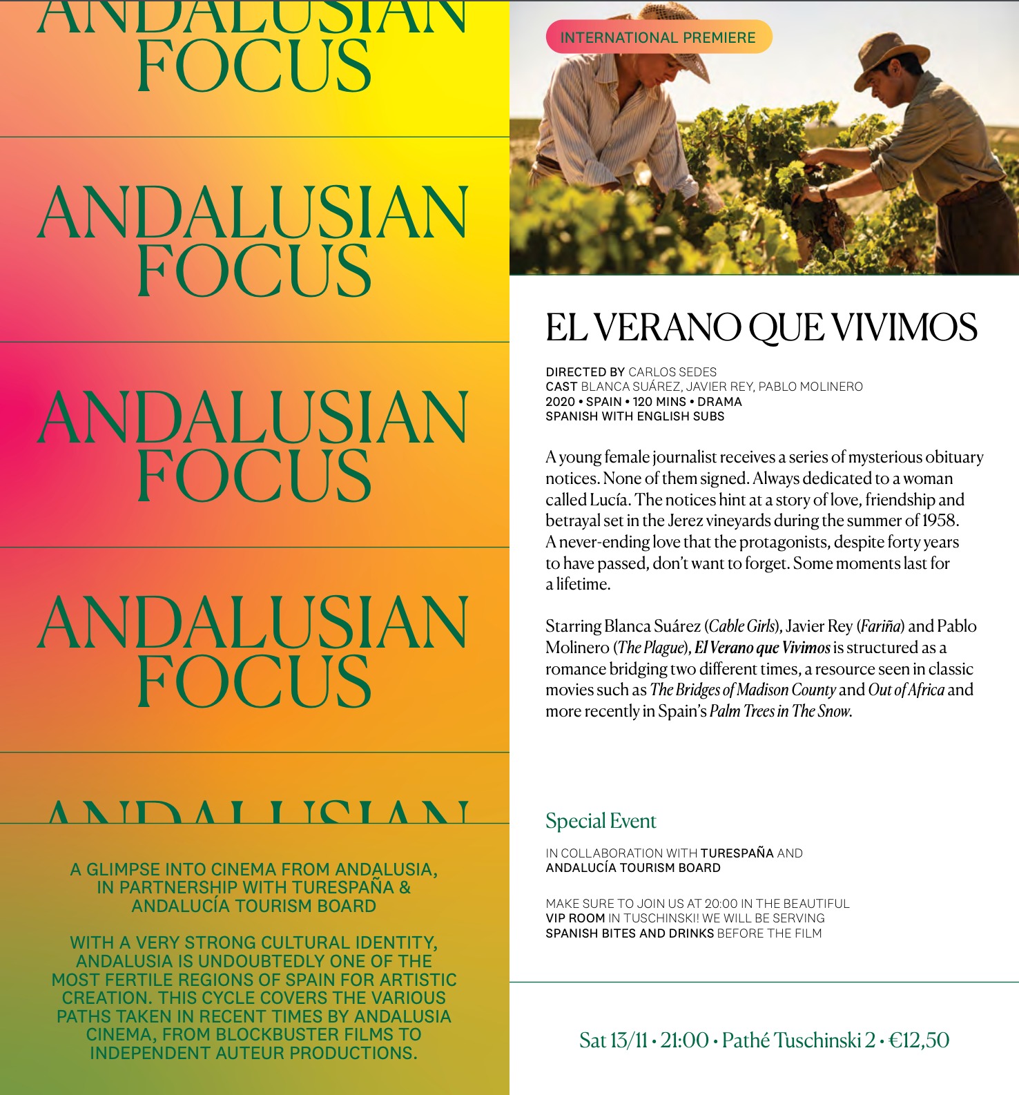 También se proyectará el documental ‘Antonio Machado, los días azules’ y ‘El verano que vivimos’, producciones que estarán acompañadas respectivamente por una presentación del destino y una degustación gastronómica de productos andaluces, en colaboración con Turespaña y el Instituto Cervantes.